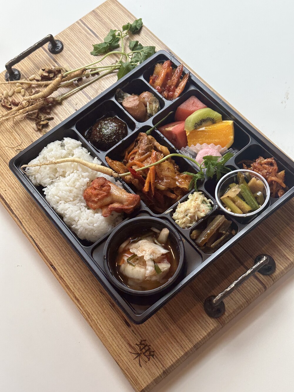 제육(국내산생돼지고기) + 잡곡밥 + 궁채 + 샐러리장 + 햄볶음 + 진미채 + 칠리새우 + 해물냉채 + 미니함박스테이크 + 과일3종 + 아이스떡 + 물김치설명